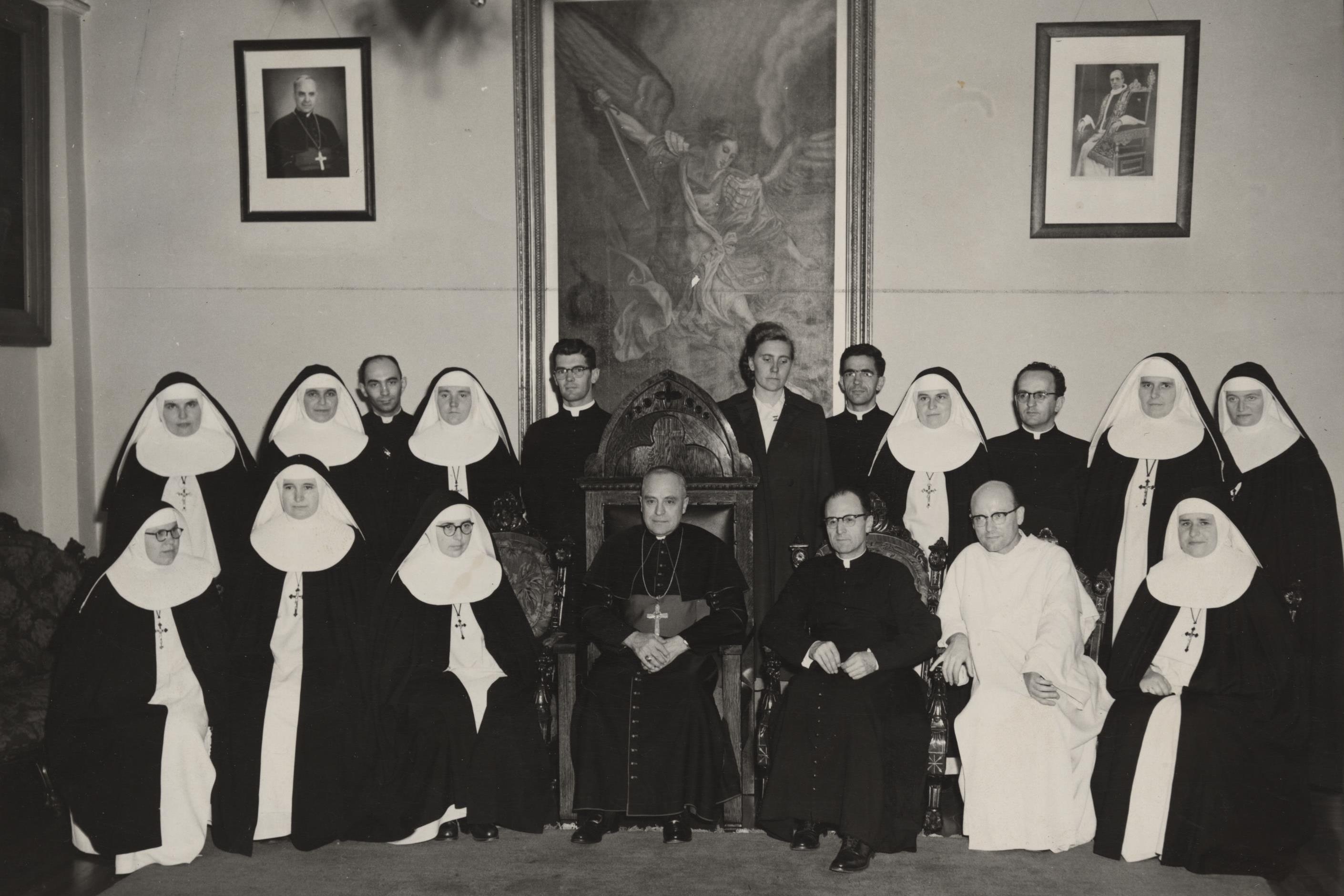 17 octobre 1953, arrivée des Dominicaines des Saints-Anges Gardiens à Sherbrooke. Dans le salon de l’archevêché Mgr Georges Cabana est entouré des religieuses Dominicaines, du Père Charles Janin, de prêtres et de mademoiselle Cavlov.